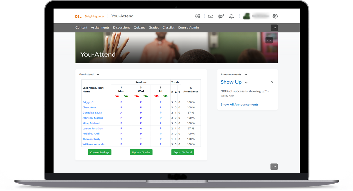 Just by logging into their online course, a student's attendance can be recorded for the day. Great for online and hybrid courses.